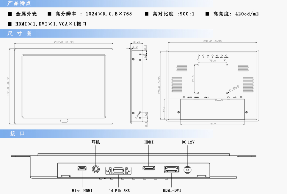 | 信号连接线 | 14 针 SKS 线,USB-Mini USB 转接线,HDMI 线,HDMI-DVI 转接线 | ||