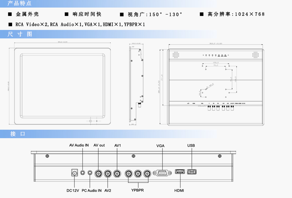 输入信号:RCA Video×2,RCA Audio×1,VGA×1,HDMI×1,YPBPR×1