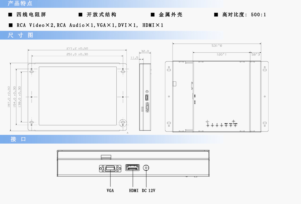 | 输入信号 | RCA Video×2,RCA Audio×1,VGA×1,DVI×1, HDMI×1 | ||