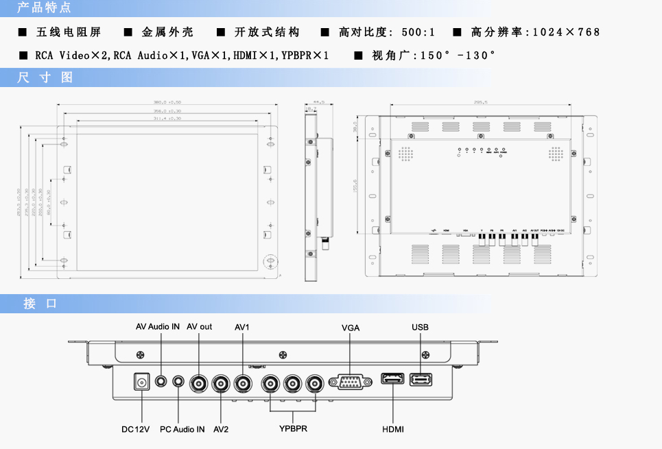 输入信号:RCA Video×2,RCA Audio×1,VGA×1,HDMI×1,YPBPR×1
