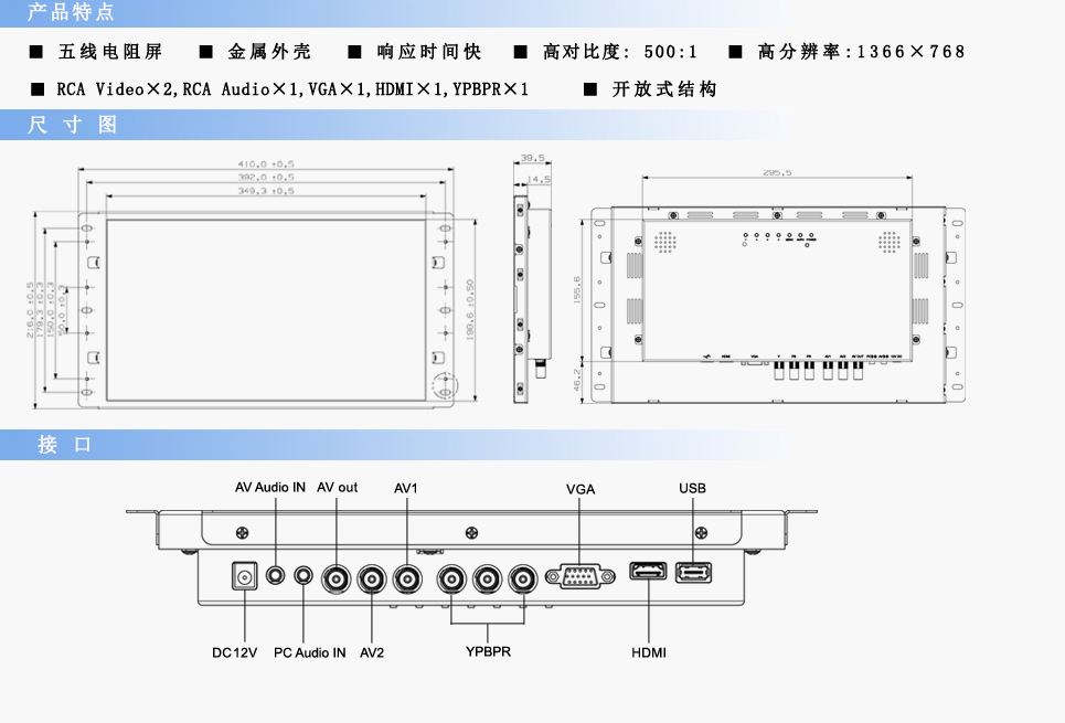 输入信号:RCA Video×2,RCA Audio×1,VGA×1,HDMI×1,YPBPR×1