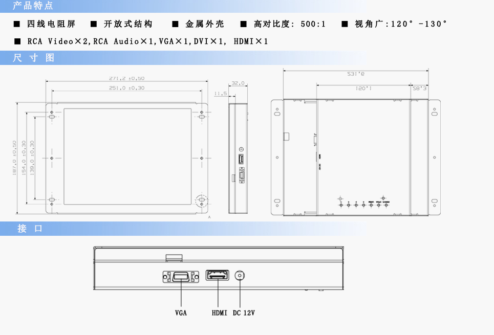 输入信号:RCA Video×2,RCA Audio×1,VGA×1,DVI×1, HDMI×1
