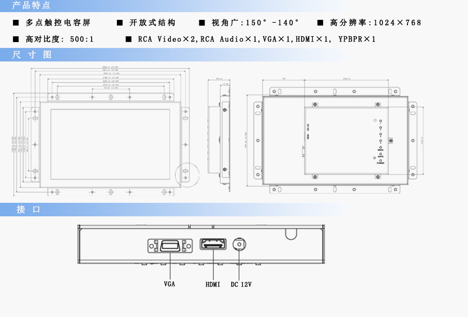 | 输入接口 | RCA Video×2,RCA Audio×1,VGA×1,DVI×1,HDMI×1 | ||