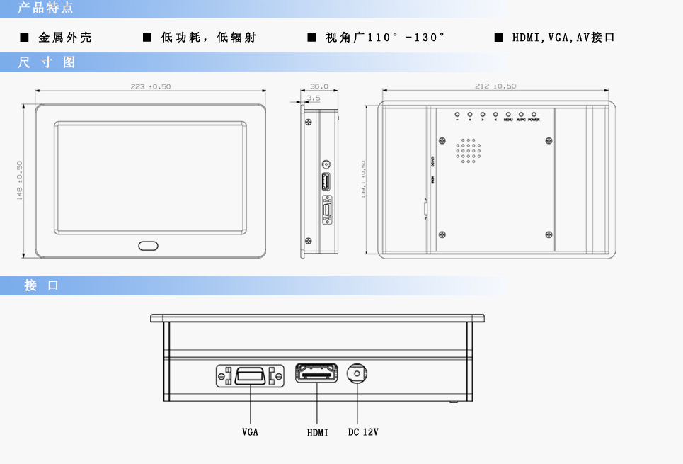 | 输入信号 | RCA Video×2,RCA Audio×1,VGA×1,DVI×1,HDMI×1 | ||
