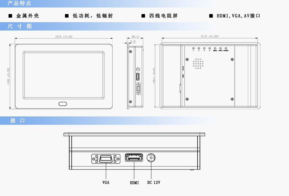 | 输入信号 | RCA Video×2,RCA Audio×1,VGA×1,DVI×1,HDMI×1 | ||